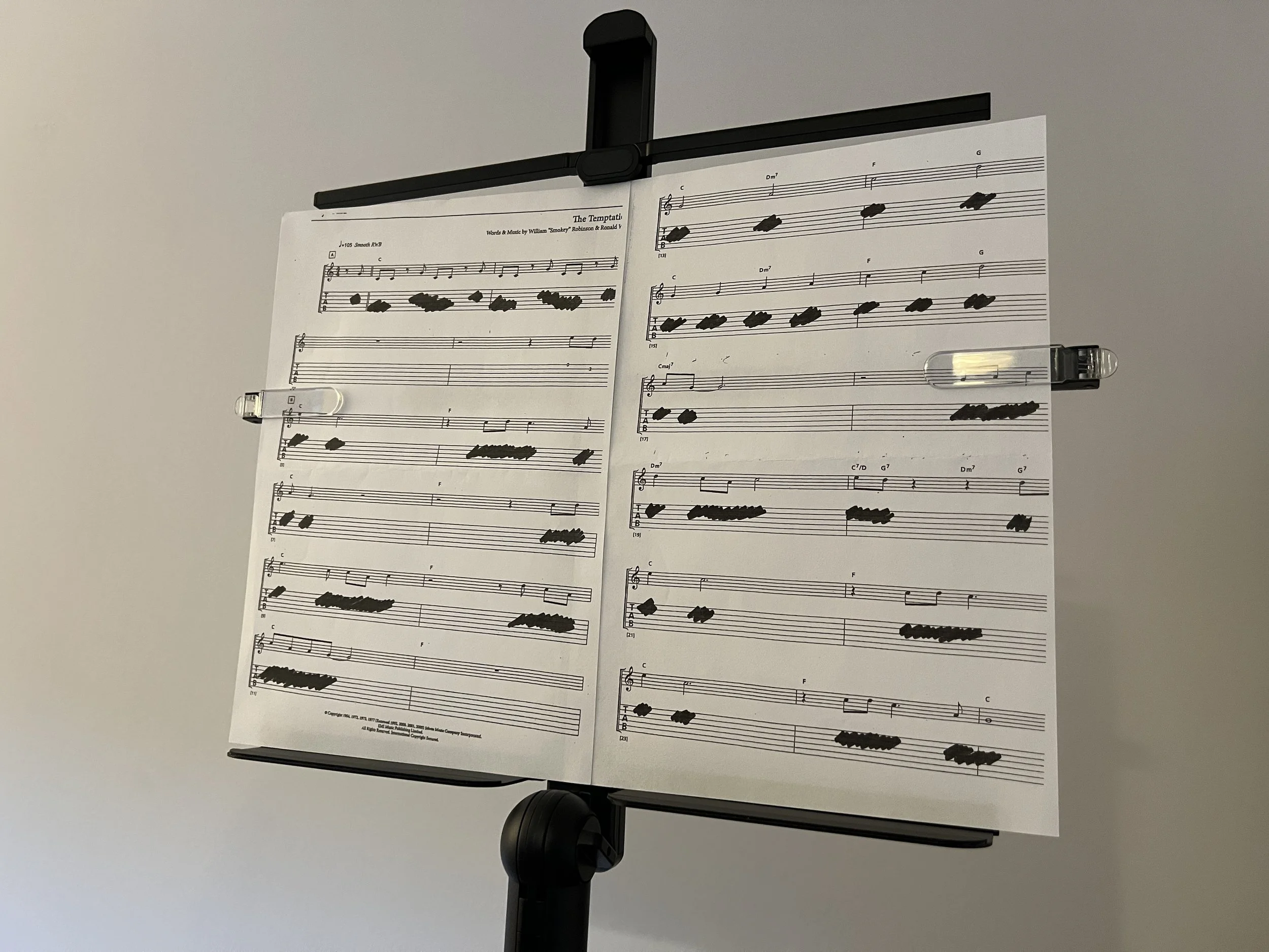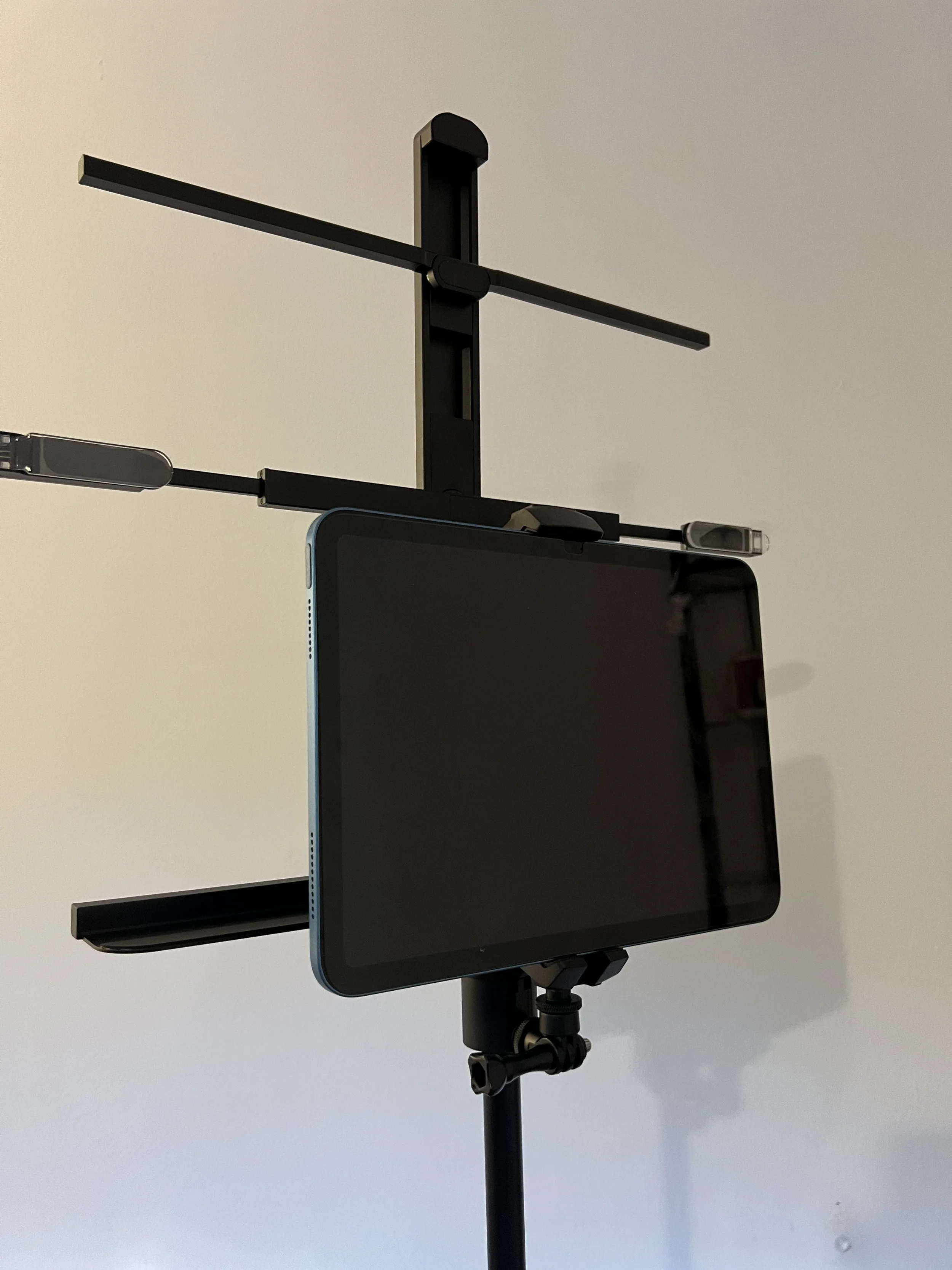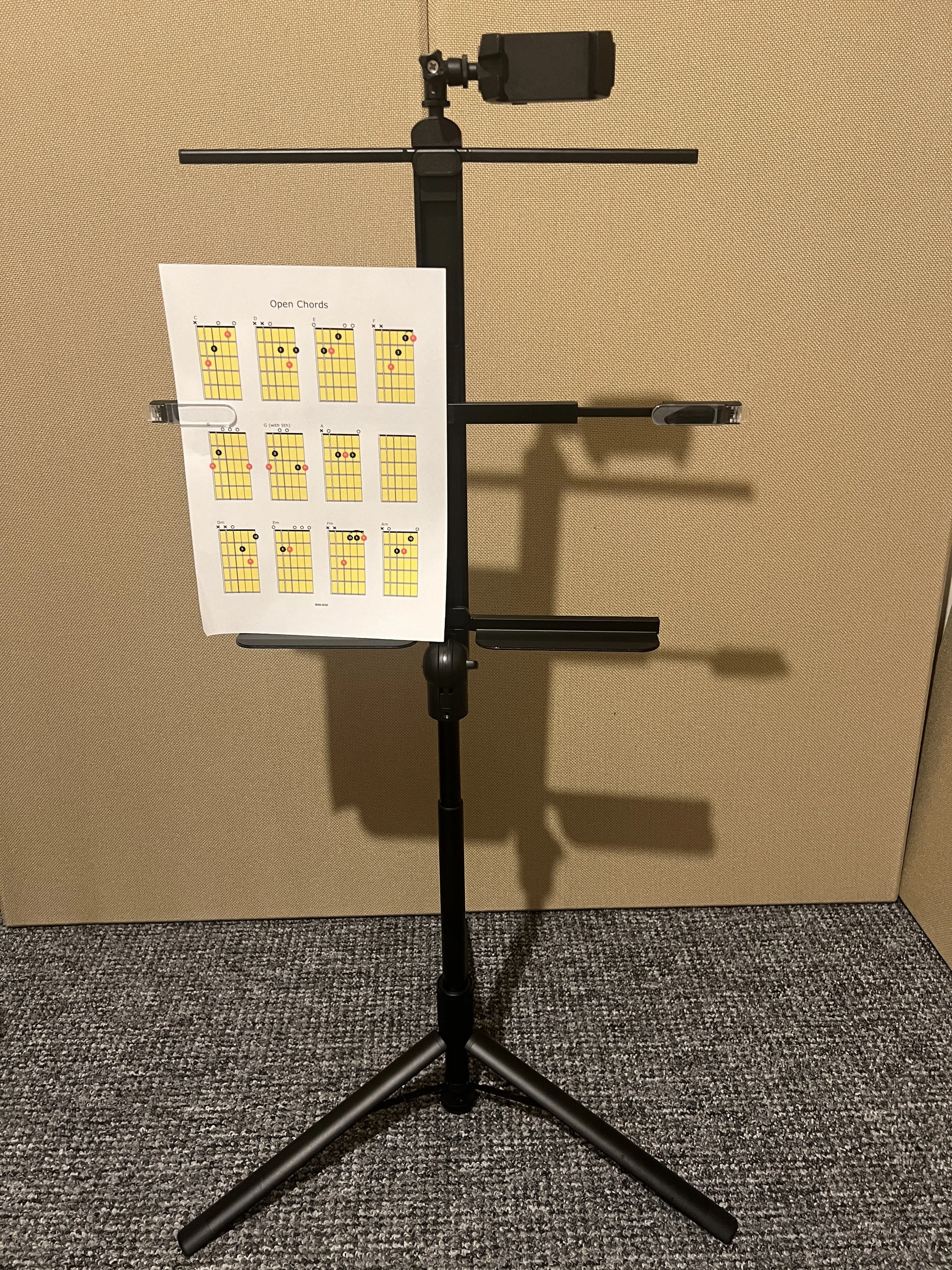 The top arm can be slid down to the desired height, and you can choose the desired angle by tilting the tray. At this point the stand is set up and ready to use. You can clip in your music book/sheets by using the clear clips on either side of the middle arm which are extendable on both sides.